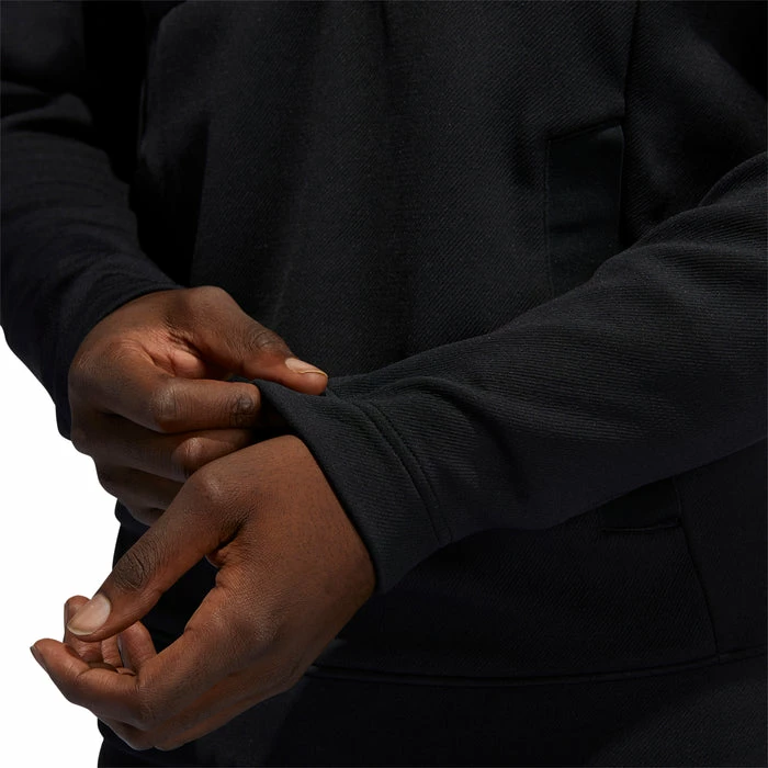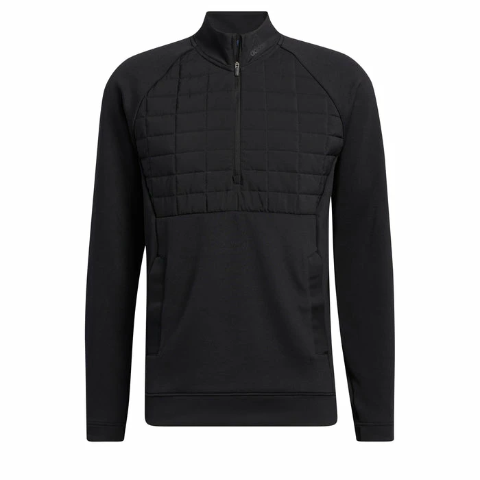 Play through cool, damp weather in this adidas golf pullover. The cosy doubleknit build features a quilted overlay for extra warmth, and a water-repellent finish sheds light rain showers. The quarter-zip design has a stand-up collar for extra coverage, and pockets keep your hands warm between shots.